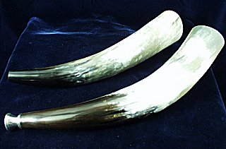 Rufhoerner, auch Blashoerner oder Signalhoerner genannt, sind aussen genauso schoen poliert wie unsere Trinkhoerner, doch werden sie nicht lackiert, und haben statt einer Spitze eyne Bohrung oder ein Mundstueck, so dass darauf wie auf z.B. eynem Waldhorn oder eyner Trompete Toene erzeugt werden koennen, die weythin schallen.
